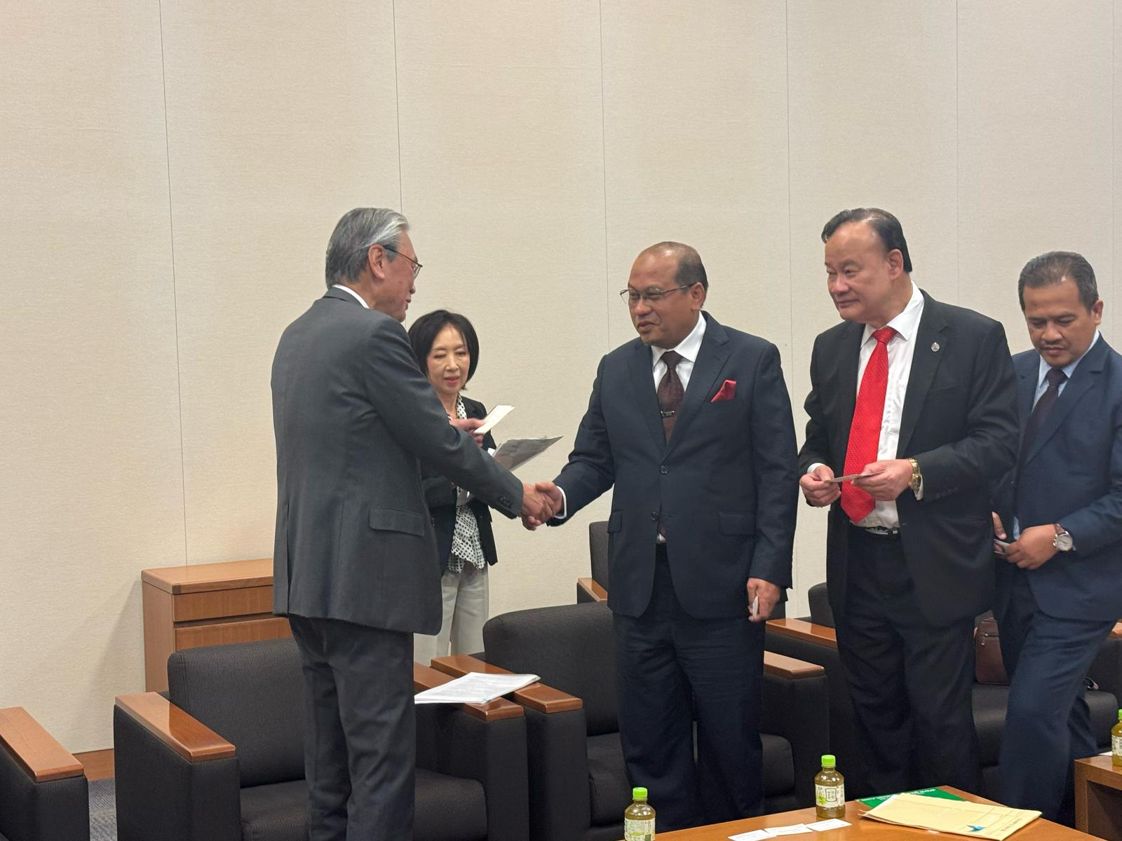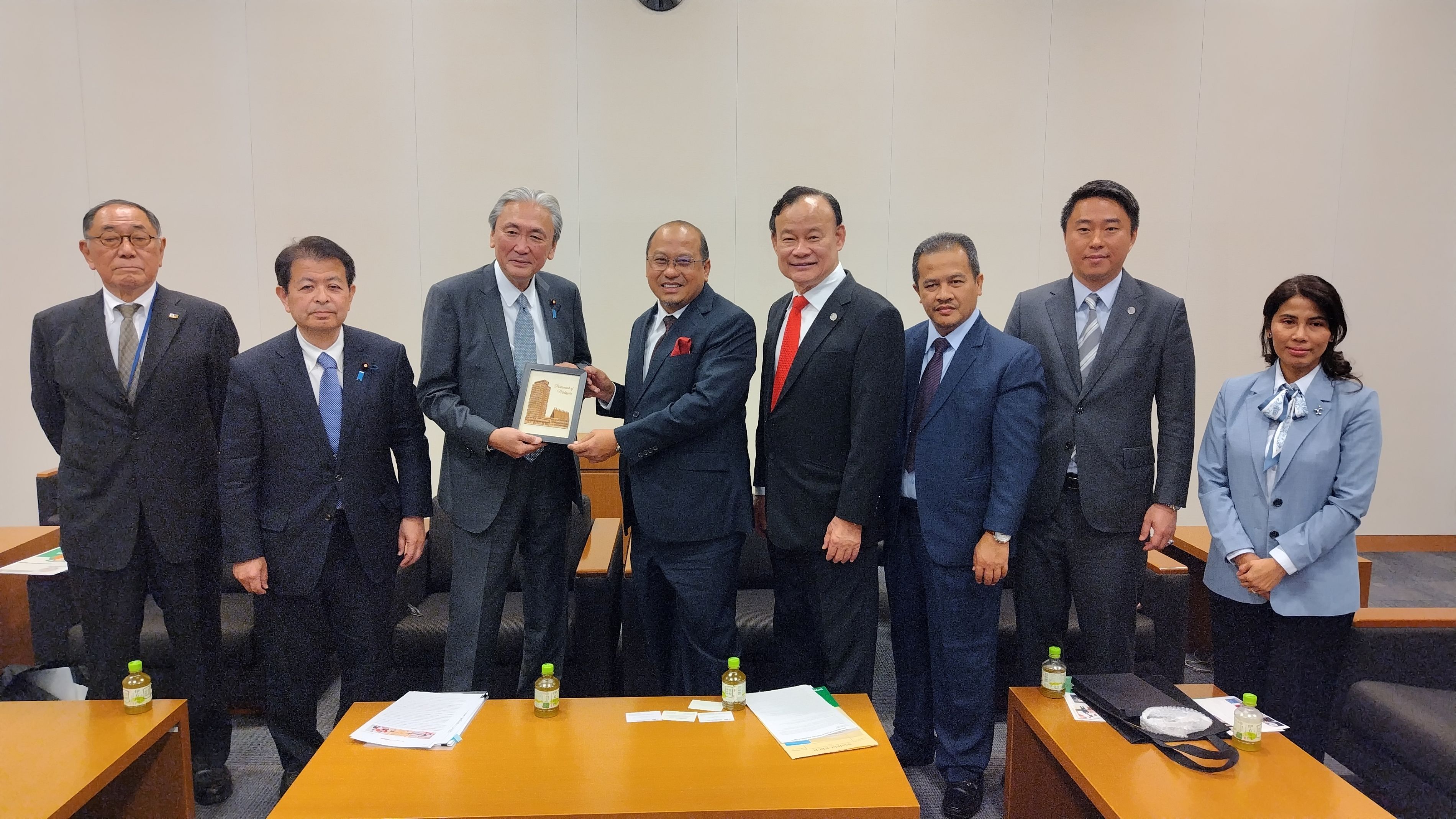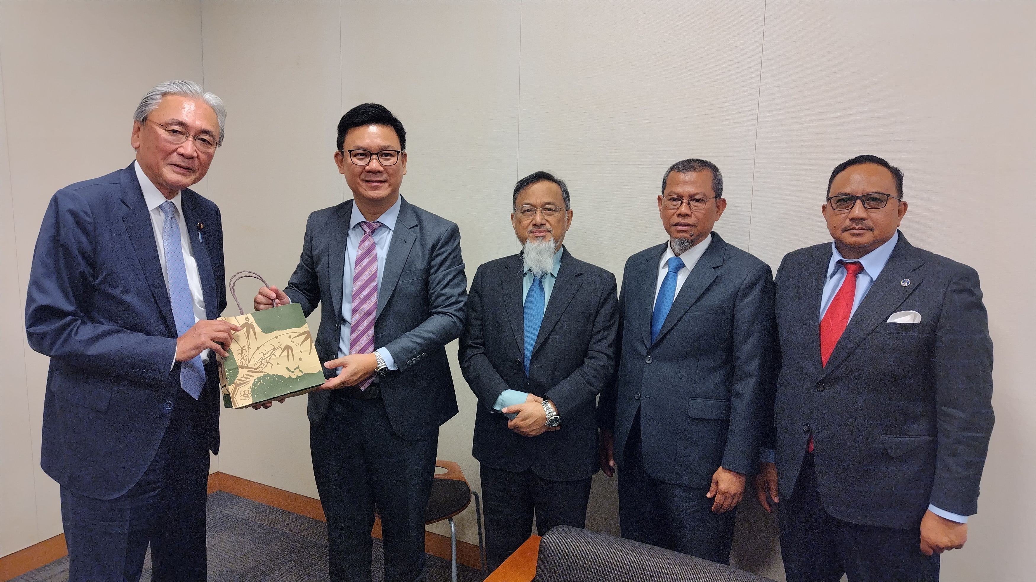 四月一五日(火)午前一〇時三〇分から一一時三〇分、衆議院議員第二議員会館国際会議室にて、マレーシア国会下院「環境・科学・植林特別委員会」に所属するマレーシア下院議員と随行員、総勢一一名の視察団との会合を行いました。 環境・科学・植林特別委員会として来日した下院議員は、団長のダト・ハジ・アフマド・アムザッド委員長(元科学技術イノベーション省副大臣、トレンガヌ州クアラ・トレンガヌ選出、国民同盟・野党)、ダト・ラリー・スン委員(元サラワク州首相府副大臣、サラワク州ジュラウ選出、マレーシア国民党・与党)、ダト・ゲー・コーハム委員(元ペラ州議会議長、ペラ州ブルアス選出、民主行動党・与党)、ロディヤ・サピー委員(サラワク州バタン・サドン選出、サラワク政党連合・与党)、ダト・アズマン・ナスルディン委員(クダ州パダン・スライ選出、国民同盟・野党)の五名で、本協会からは、古屋会長(日マ友好議連会長)、小川理事長、森林理事、新井専務理事、小菅理事補が参加したほか、友好議連から宮下事務局長が会合に同席しました。