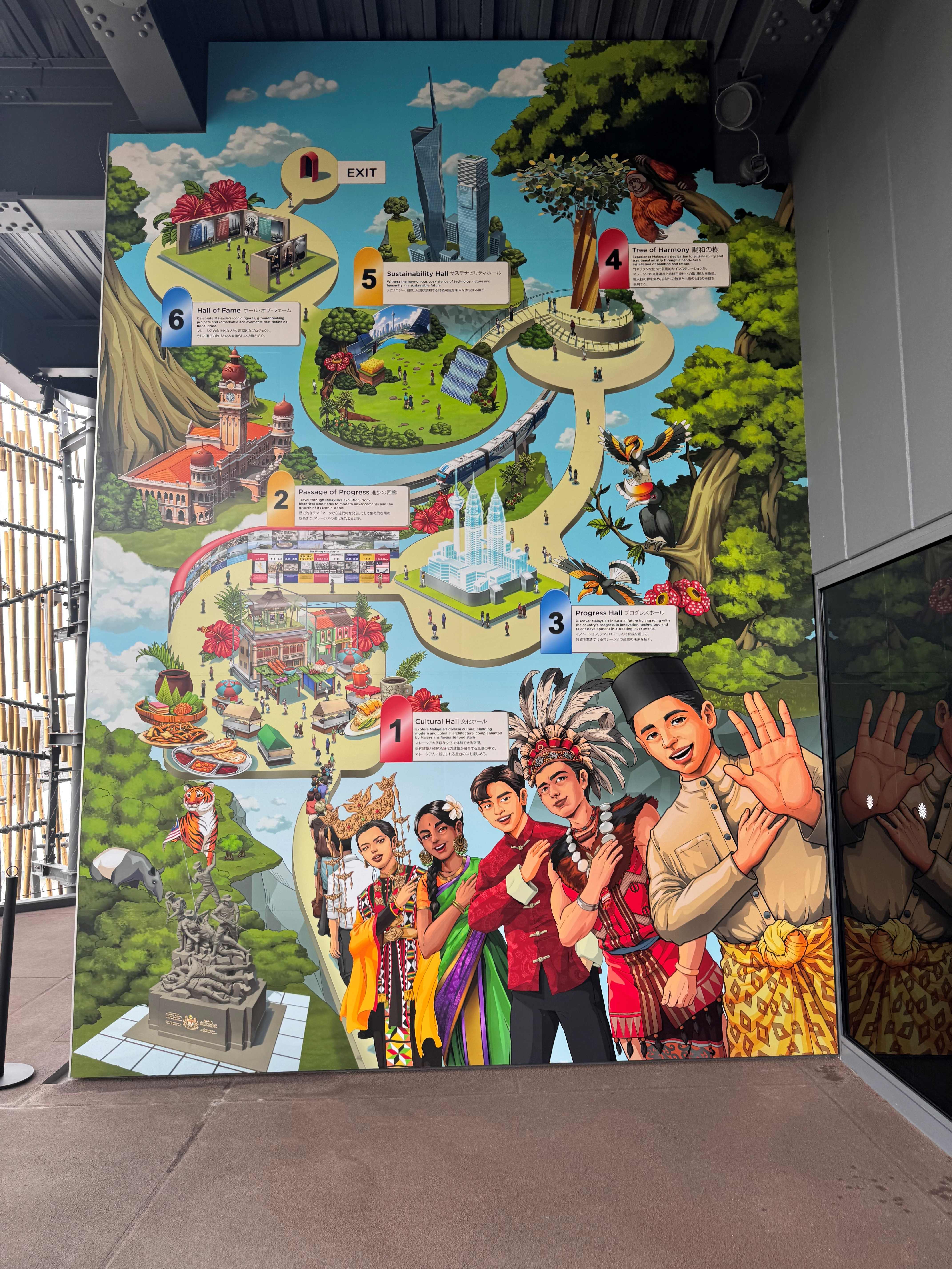 マレーシア館は「調和の未来を紡ぐ」をテーマに展示をしており、展示の入り口は二階で一階はお土産や飲食の販売が行われています。二階からマレーシアを知る展示を回っていけば一階に辿り着き、マレーシアを知った上で自然に買い物ができる構造になっています。二階の入り口には展示の概要が大きなボードで説明されており、①Cultural Hall(文化ホール)、②Passage of Progress(進歩の回廊)、③Progress Hall(プログレスホール)、④Tree of Harmony(調和の樹)、⑤Sustainability Hall(サステナビリティホール)、⑥Hall of Fame(ホール・オブ・フェーム)、の6つのブロックで構成されています。どれも、マレーシアの多様な文化と活気ある経済を展示することを目的としており、テクノロジー・自然・人間が調和する持続可能な未来を表現しています。