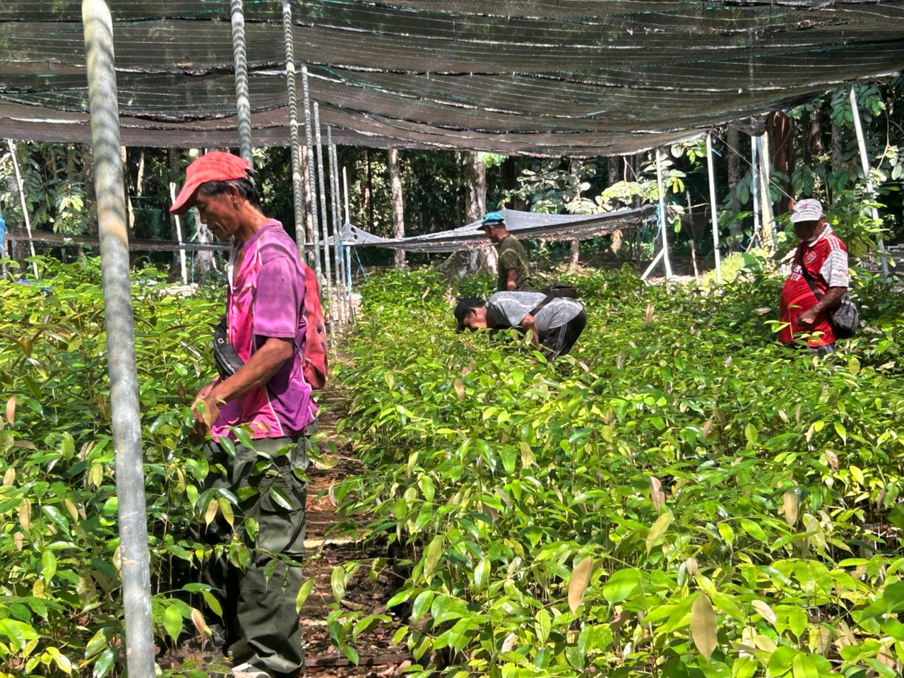 サバルFLRセンターの専用苗圃にて、本年二月に稚樹を収集・移植したフタバガキ科等在来種の育苗を継続し、順調に苗木が成長しています。