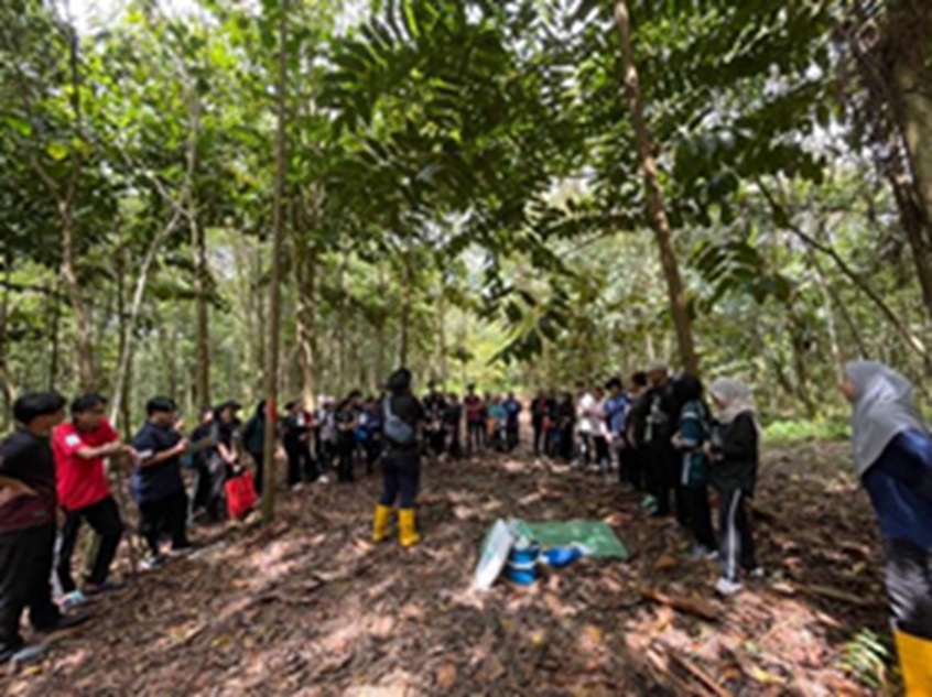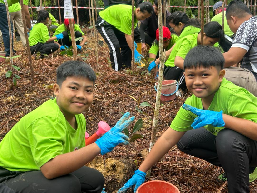 アペン国立公園周辺地域の学校と協働し、株式会社木下グループご協力による「木下の森 青少年研修プログラム」を実施しています。  五月二四日(土)、バライ・リンギン中等学校の生徒と教員五〇名とマレーシア・サラワク大学教員、州政府機関職員が参加し、植林作業と学習意欲向上プログラムを行ないました。