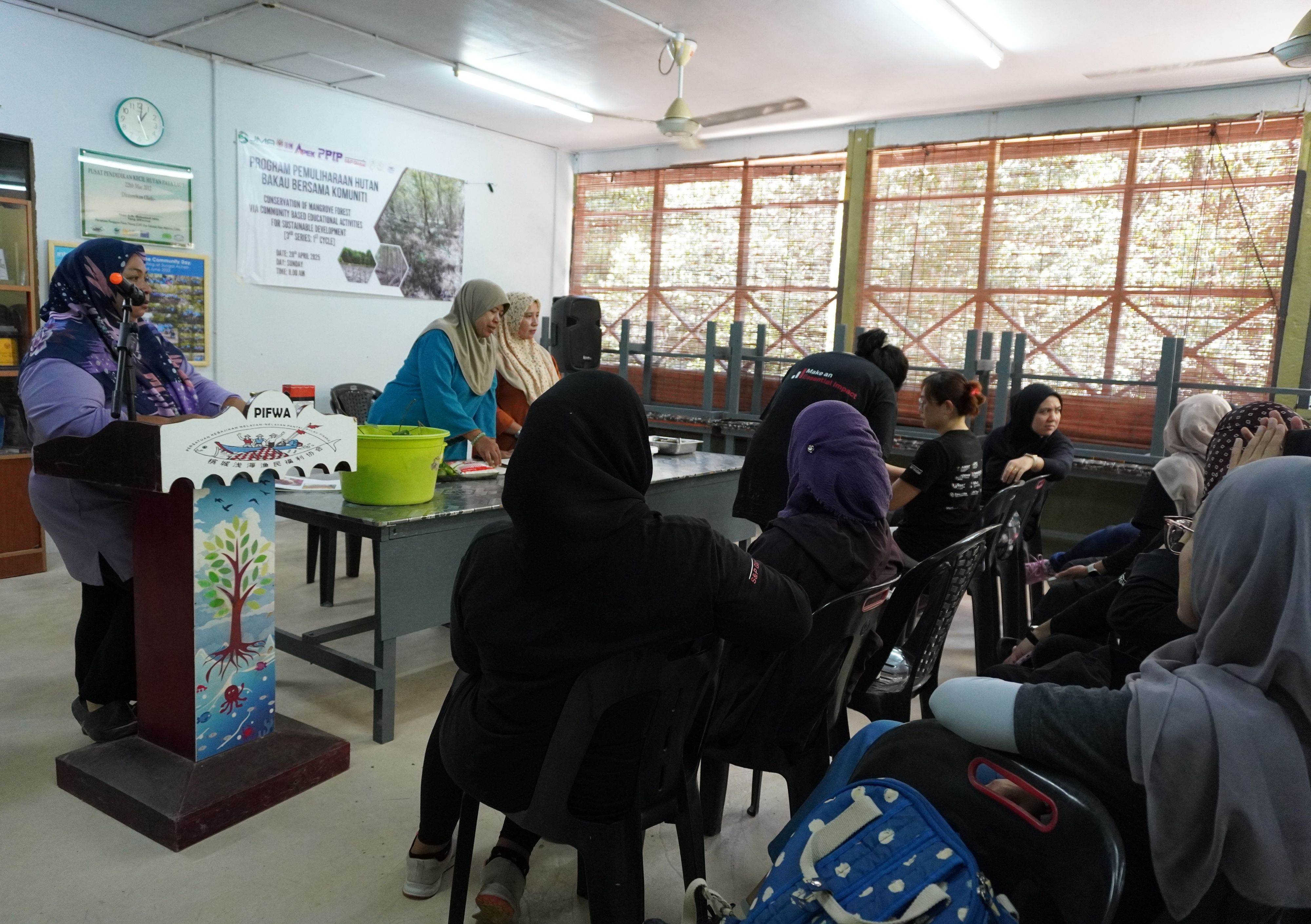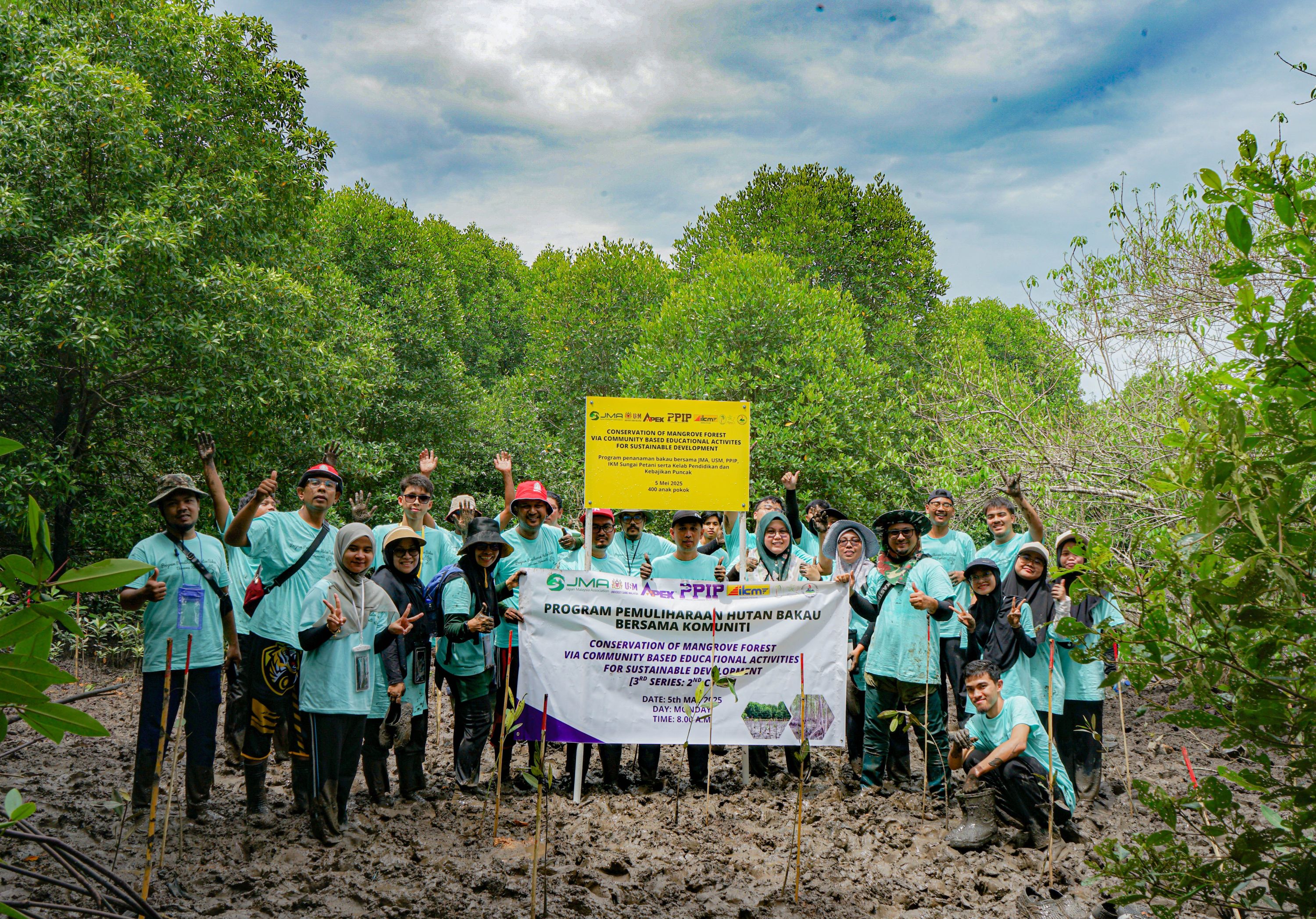 皆で三〇〇本の植林を行った後、マングローブに関する伝統的な知識を学び、保全意識を高めるためのプログラムとして、村人の指導のもと、参加者が料理し、皆で味わいました。  五月五日(月)、ムルボック保護林にて、クダ州のマラ技術専門学校の学生と教員、地域住民グループら四〇名が参加し、三〇〇本の植林作業を行いました。